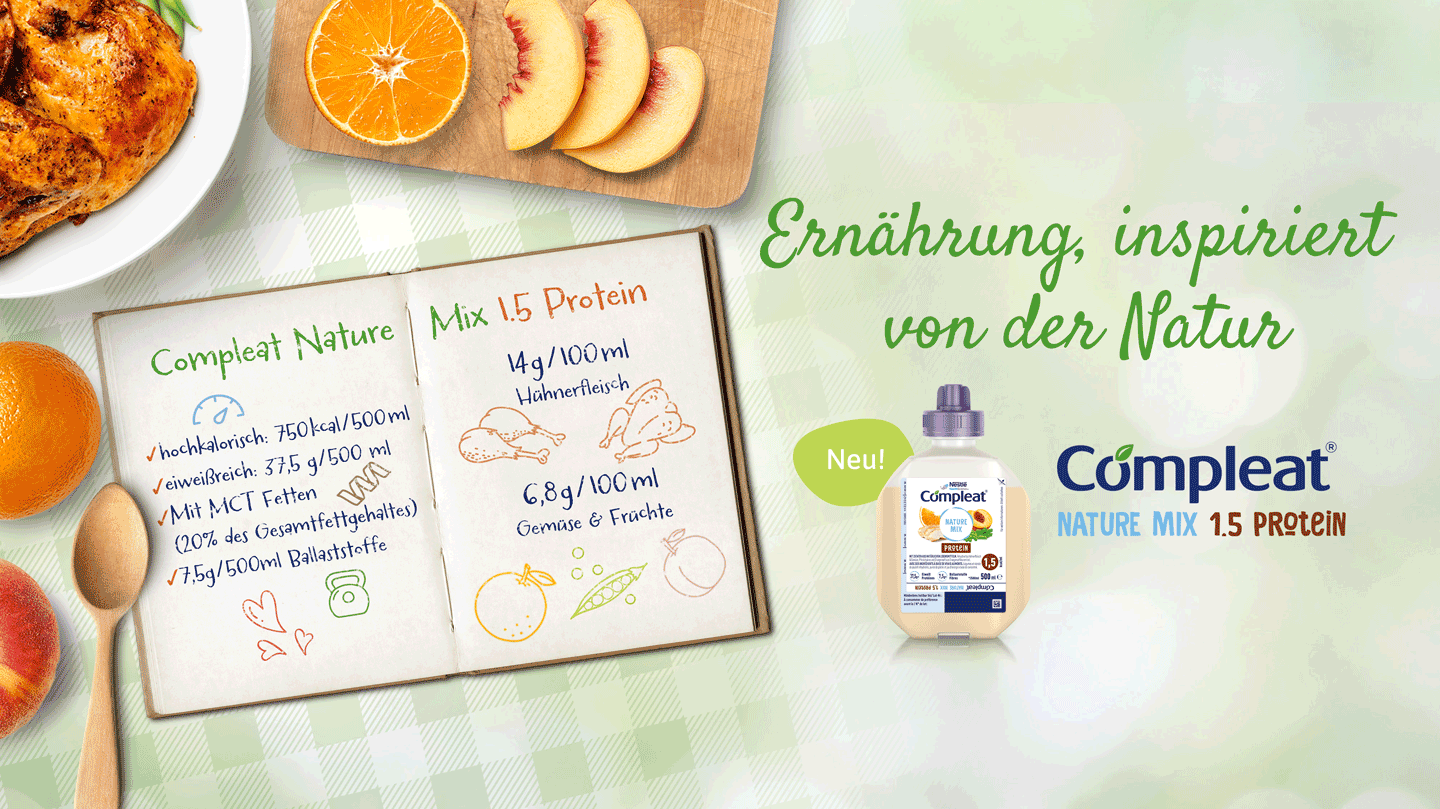 Mit Compleat® Nature Mix 1.5 Protein unterstützen Sie Ihre Patient:innen mit Nährstoffen, die sie benötigen, und den vertrauten Lebensmittelzutaten, die sie verdienen. Bei einem normalen Nährstoffbedarf entdecken Sie jetzt Compleat® Nature Mix. Für Kinder ab 1 Jahr entdecken Sie jetzt Compleat® Paediatric Nature Mix.