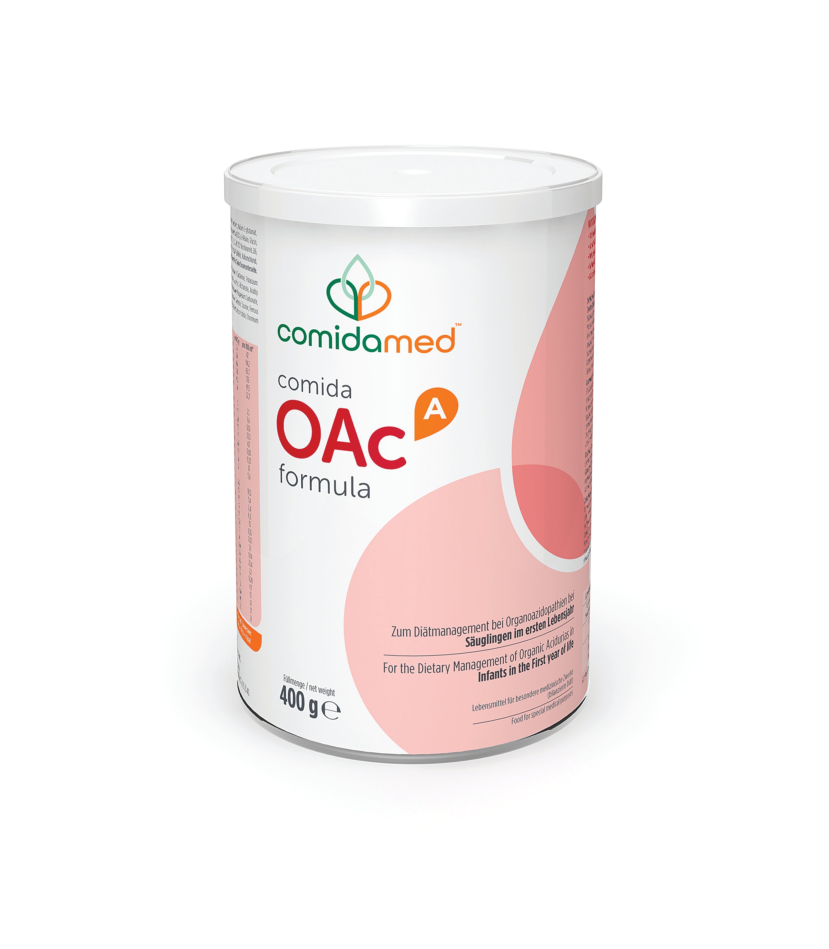 comida-OAc A formula ist eine methionin-, threonin- und valinfreie (kein Zusatz von Methionin, Threonin oder Valin) sowie isoleucinarme Spezialnahrung mit essentiellen und nichtessentiellen Aminosäuren. Zum Diätmanagement bei Organoazidopathien (OAc), z. B. Methylmalonazidämie und Propionazidämie (MMA/PA).